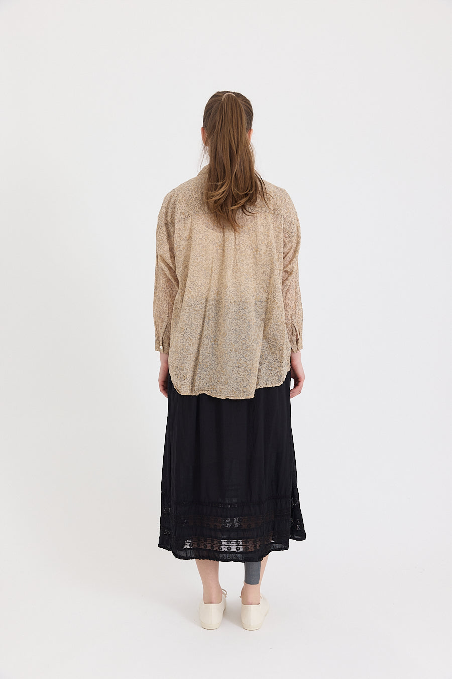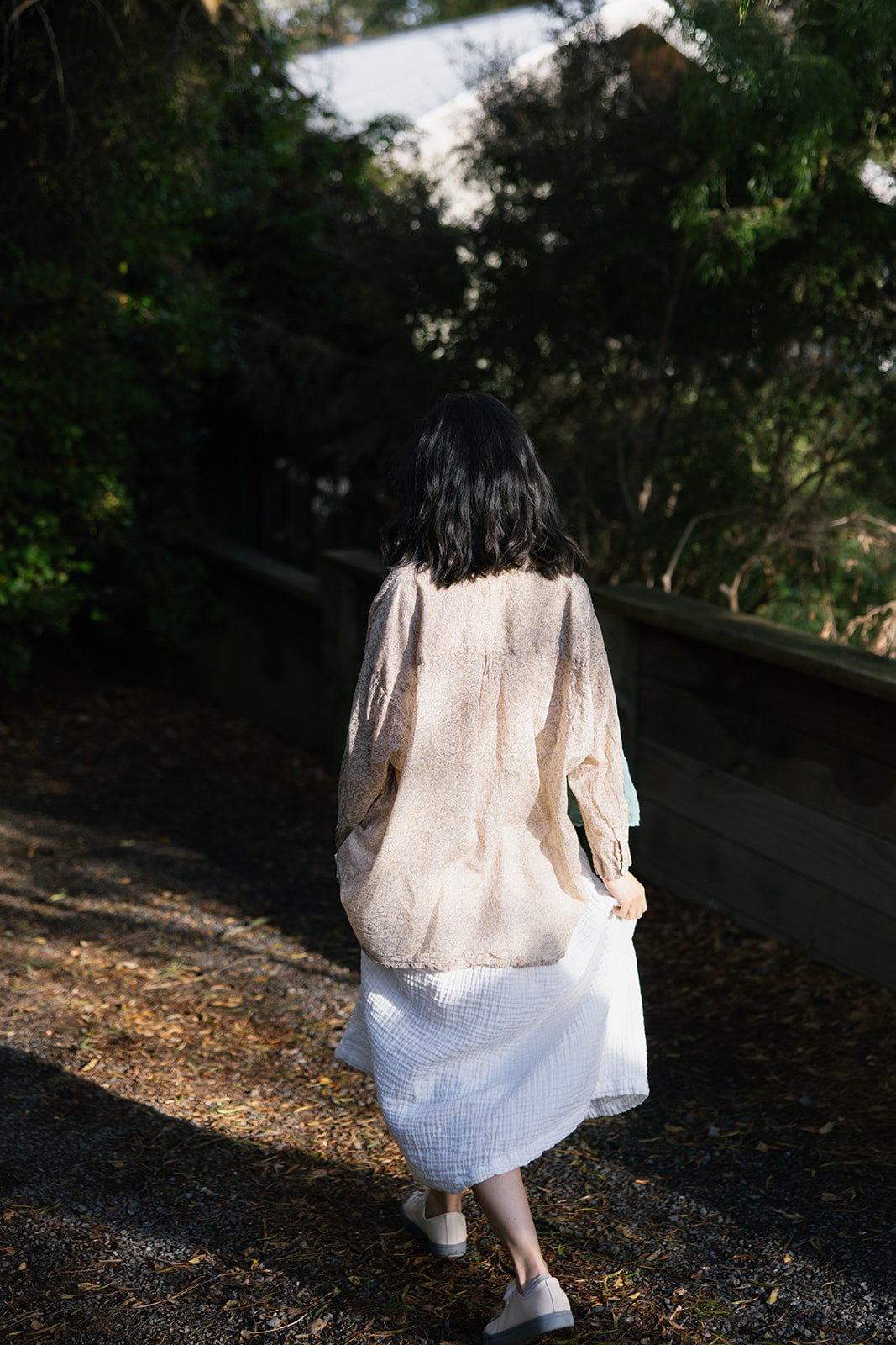 Indra Shirt in Ginza Print is a boxy, a-line shaped shirt with a relaxed fit, crafted in a beautiful, soft, cotton voile. Featuring kimono style side paneling, cropped 3/4 length dolman sleeves, full button through front. The curved hem and centre back pleat allow for an elegant drape. The hand screen print is inspired by an antique fabric found at a vintage market in Japan. The print was faded in areas and this detail was carried over into the final design to capture the character, and patina of the vintage piece.