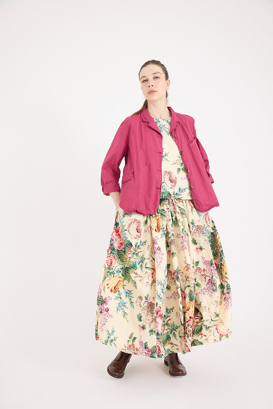 The Dominique Blazer in Cotton Poplin; A favourite style with our customers, the Dominique Blazer is an oversized, unlined jacket, perfect for lightweight layering in the summer months. This style features a single chest welt pocket and two hip pockets with tuck-able pocket flaps, the single back vent offers drape and comfortable range of movement. The sleeves are designed to be rolled, for elegant styling. Available in Berry and Antique.