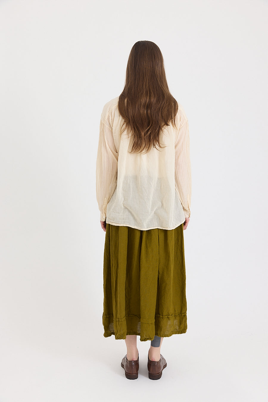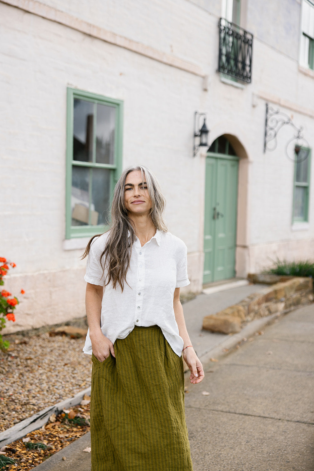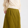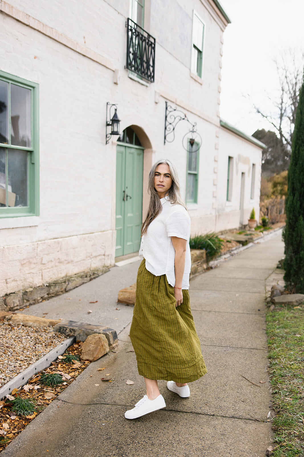 The Eden skirt is a nod to the past combined with today's sensibilities for the modern woman. A long floaty skirt with a hem pleat, flat waistband at the front, elastic waist at the back and pockets. This skirt is made from a lightweight linen so it's light and floaty to wear. Available in Chartreuse and a Chartreuse Stripe.