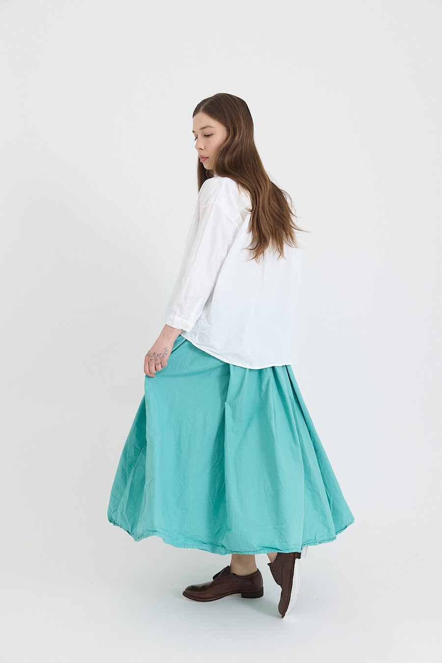 The Ulla Skirt is a classic style from Metta; crafted from a cool and crisp cotton poplin. Featuring a fully elasticated waistband, generous volume through the skirt with pleats from the waistband, two hip pockets, and an internal cotton drawstring to allow for an adjustable and comfortable fit. Garment dyed and laundered for a soft, worn-in feel.