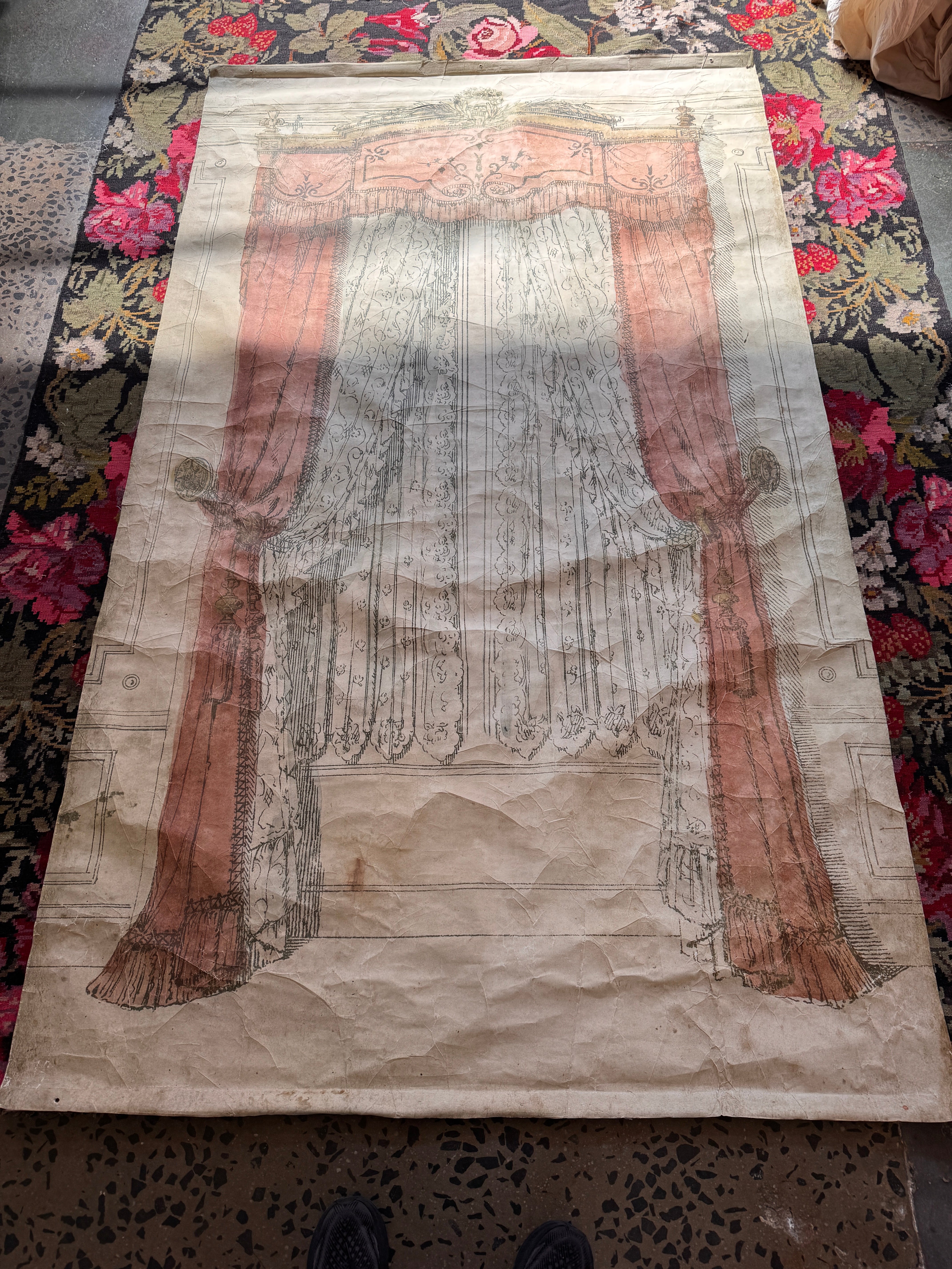 Once used for the theatre this stunning antique printed french curtain backdrop measures an impressive 145cm wide by 247cm long with the ends mounted on wooden slats for easy hanging.